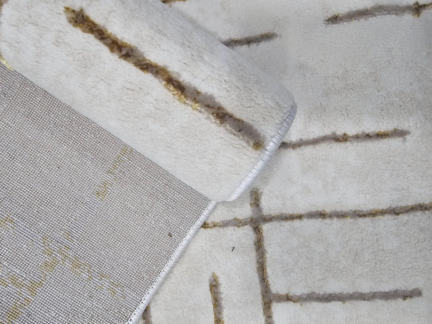 Agrega elegancia y estilo contemporáneo a tus ambientes con la Alfombra Turca Beige – TURKIYEE, una pieza decorativa inspirada en el arte moderno, con un suave fondo beige claro y finas líneas doradas entrecruzadas que aportan sofisticación visual sin saturar el espacio.