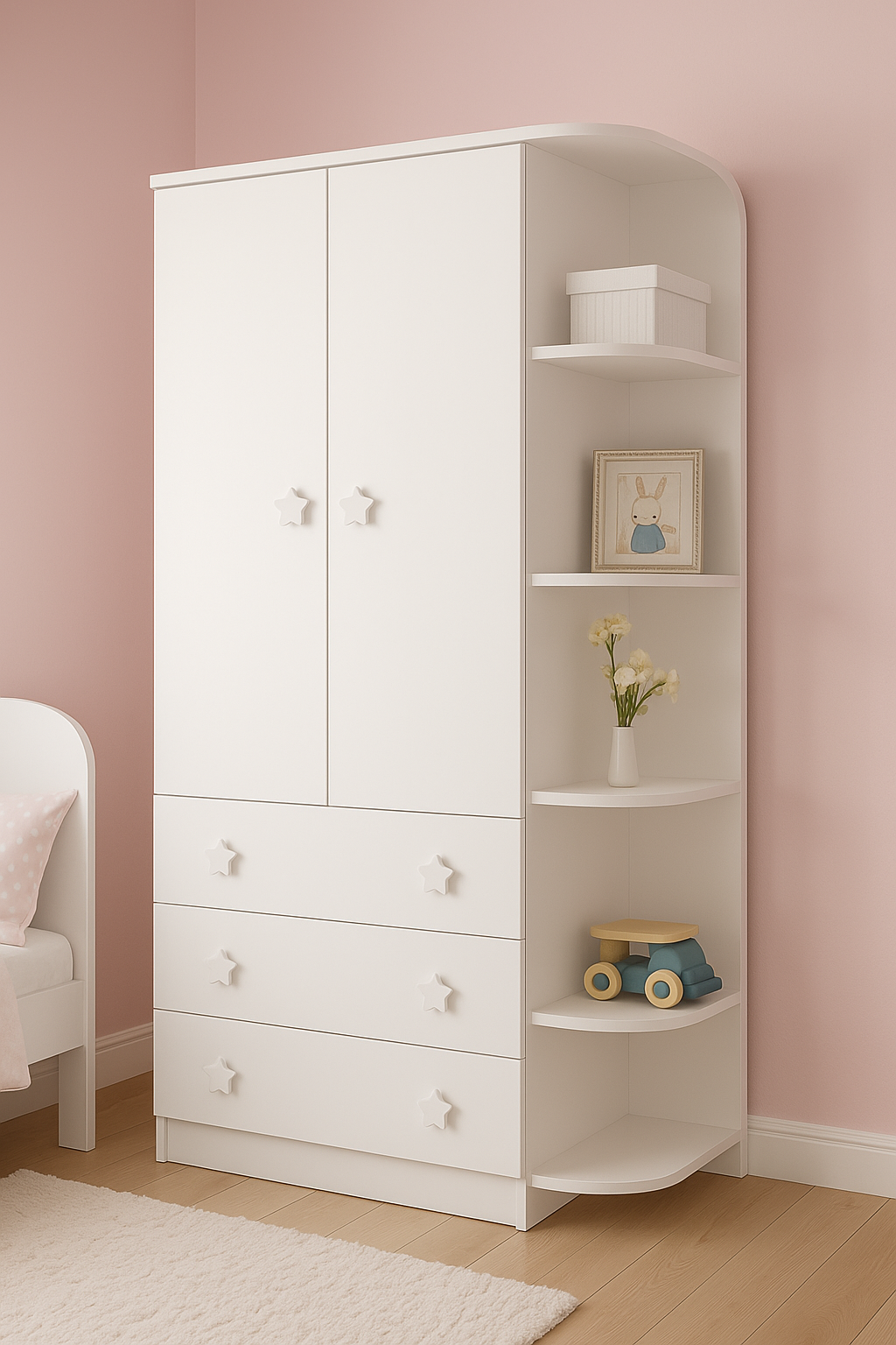 Con su diseño práctico y su tamaño perfecto, este clóset permite guardar ropa, juguetes y accesorios de manera accesible para los pequeños, ayudando a fomentar hábitos de orden desde los primeros años. Su estética minimalista y sus detalles delicados lo convierten en una pieza que complementa perfectamente cualquier habitación de niña.