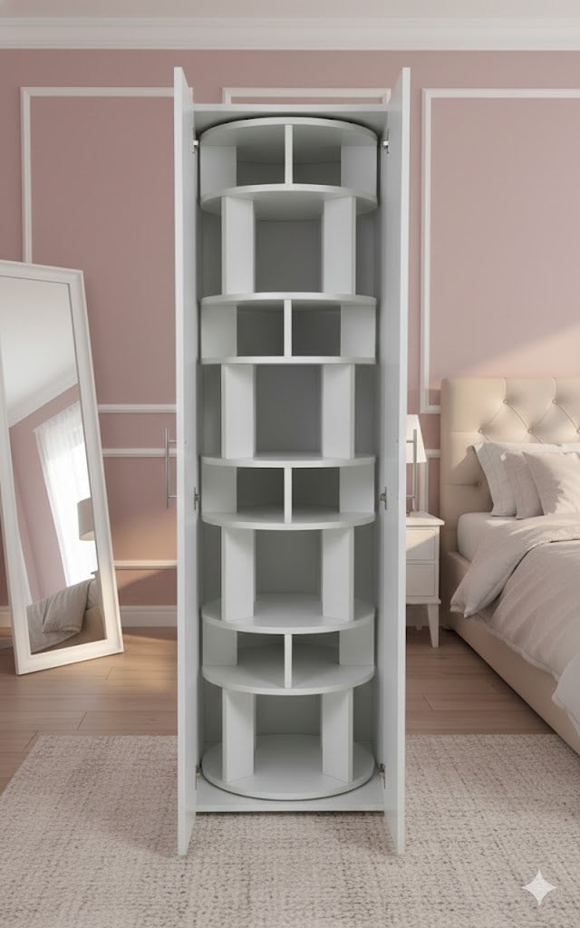 Su innovador diseño redondo permite acceder fácilmente a todos tus zapatos con un simple giro, haciendo que elegir el par perfecto sea rápido y cómodo.