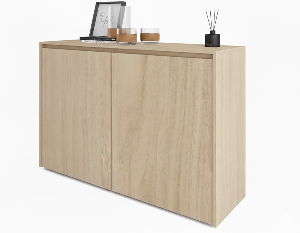 Fabricada en melamina premium de 18mm, en acabado natural en melamina Panela, aporta una estética cálida y elegante ideal para departamentos modernos, dormitorios, entradas o cuartos auxiliares.