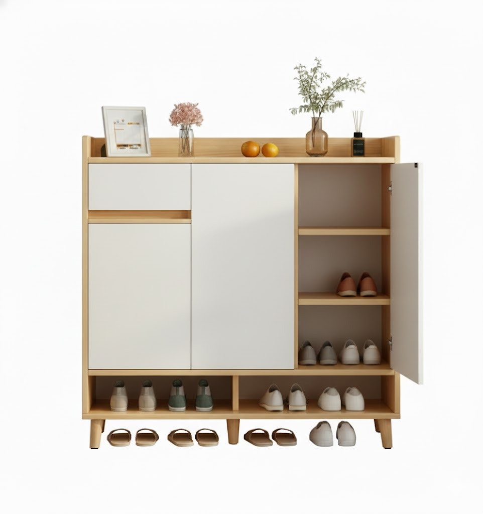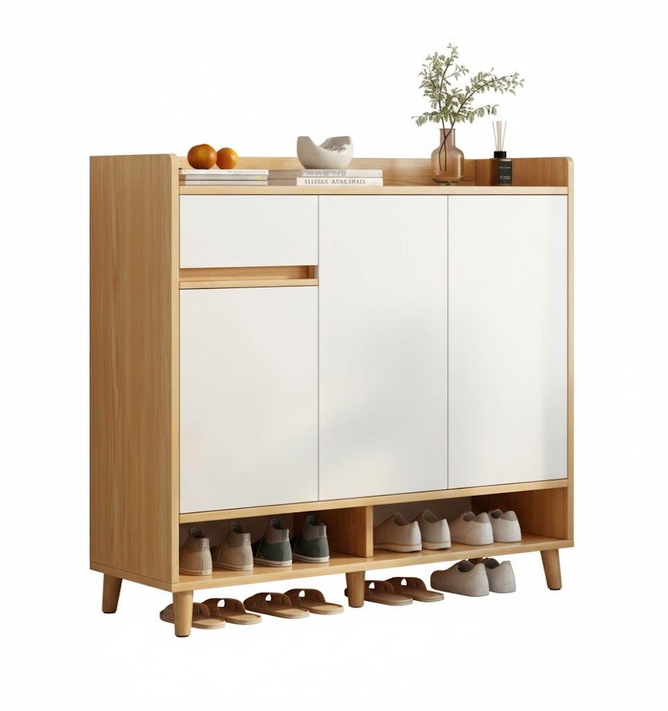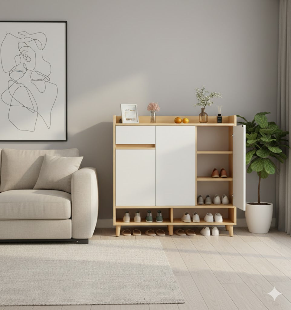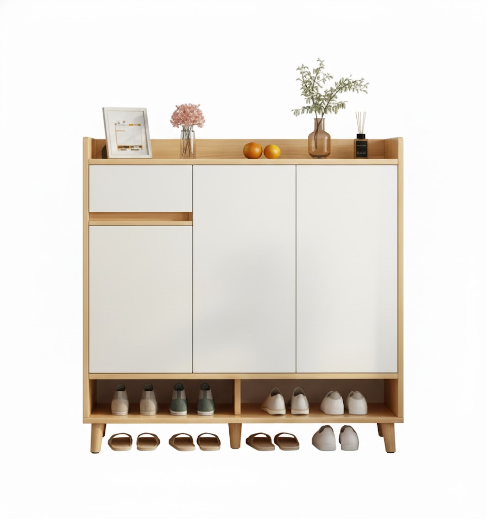Fabricada en melamina premium de 18mm con acabado tipo madera natural y puertas blancas mate, crea un contraste elegante ideal para ambientes modernos. Incluye estantes internos regulables que se adaptan a zapatillas, sandalias, tacones o calzado deportivo, así como un cajón superior perfecto para llaves, accesorios o artículos personales.