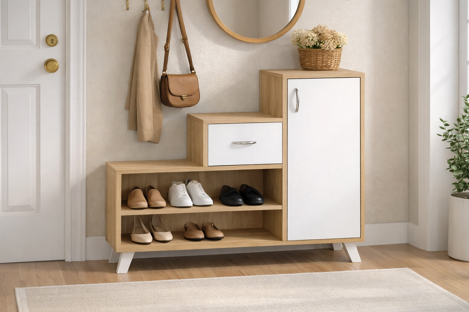Fabricada en melamina Pelikano Panela de 18mm, aporta calidez y un acabado elegante ideal para ambientes modernos en entradas, pasillos, dormitorios o cuartos auxiliares.